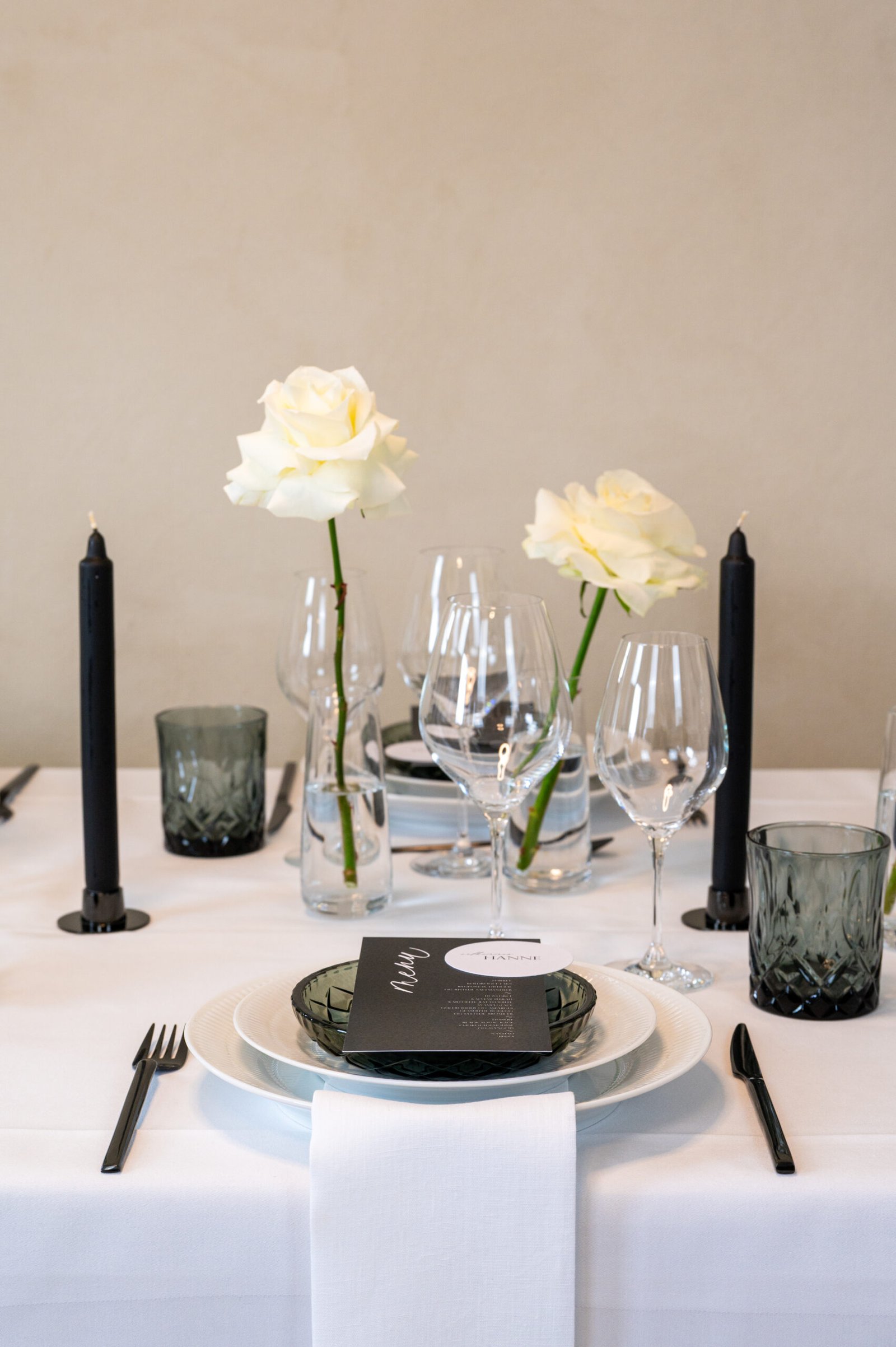 Det tidløse og elegante look: For en klassisk og uovertruffen borddækning kan du kombinere Cabernet-glassene med vores Hvid Riflet stel fra Royal Copenhagen. Sammen med et smukt sølvbestik skaber du et udtryk af ren og tidløs elegance, der er perfekt til et traditionelt bryllup eller en fin middag.